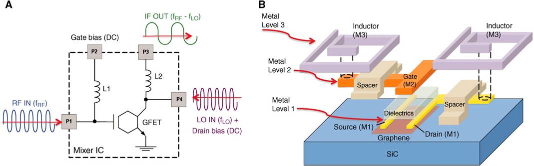 The essential components in RF electronics are mixer and amplifier, and the speed of the transistors which make up these devices strongly affects the operating frequency of the devices. Recent study on graphene mixer indicates a RF performance of 10 GHz and optimization can further enhances the operating frequency. However, graphene FET also exhibit a high output conductance due to the zero-bandgap, leading to a lower gain and is not suitable for amplifier applications. (Figure from Science)